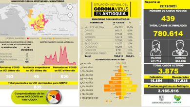 439 casos nuevos registrados de COVID-19 en Antioquia.