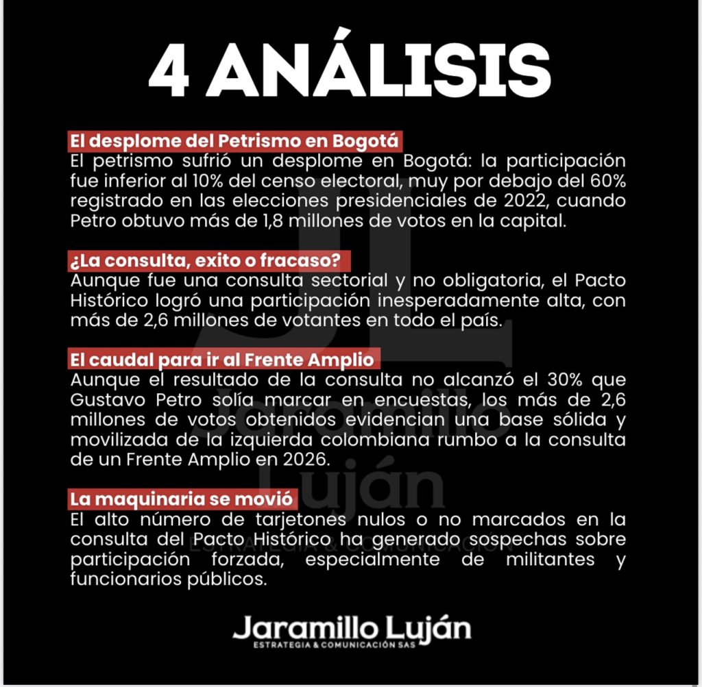 Miguel Jaramillo, analista político y comunicador, con su equipo de trabajo, compartió su visión sobre los resultados de la consulta del Pacto Histórico y las implicaciones que dejan en el panorama electoral de Colombia. A través de un informe especial preparado por Jaramillo Luján Estrategia y Comunicación, se presentan claves de análisis, hechos inéditos y noticias que permiten comprender el alcance de esta jornada democrática y sus efectos en la izquierda colombiana.