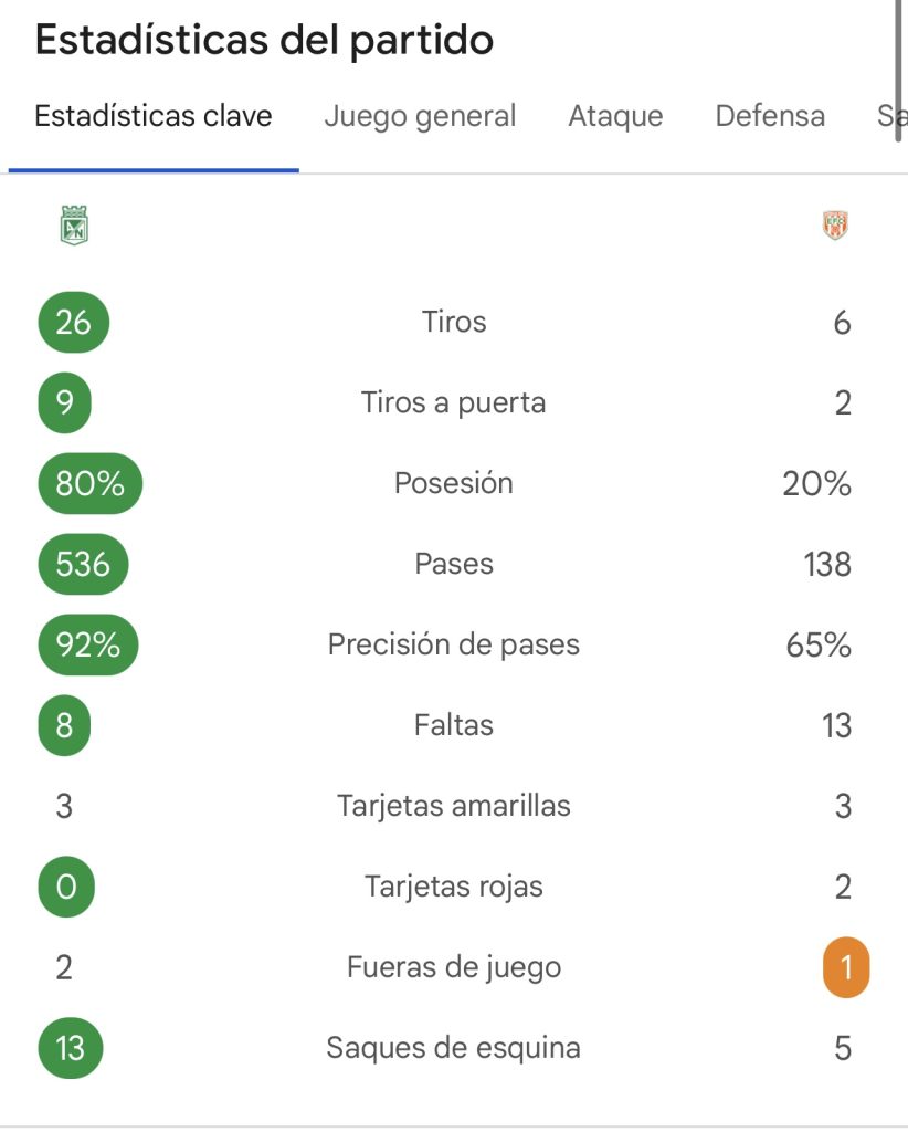 El equipo de Javier Gandolfi dominó con claridad: 80 % de posesión y 26 remates contra 6 de Envigado. Sin embargo, solo un gol marcó la diferencia en el Atanasio.