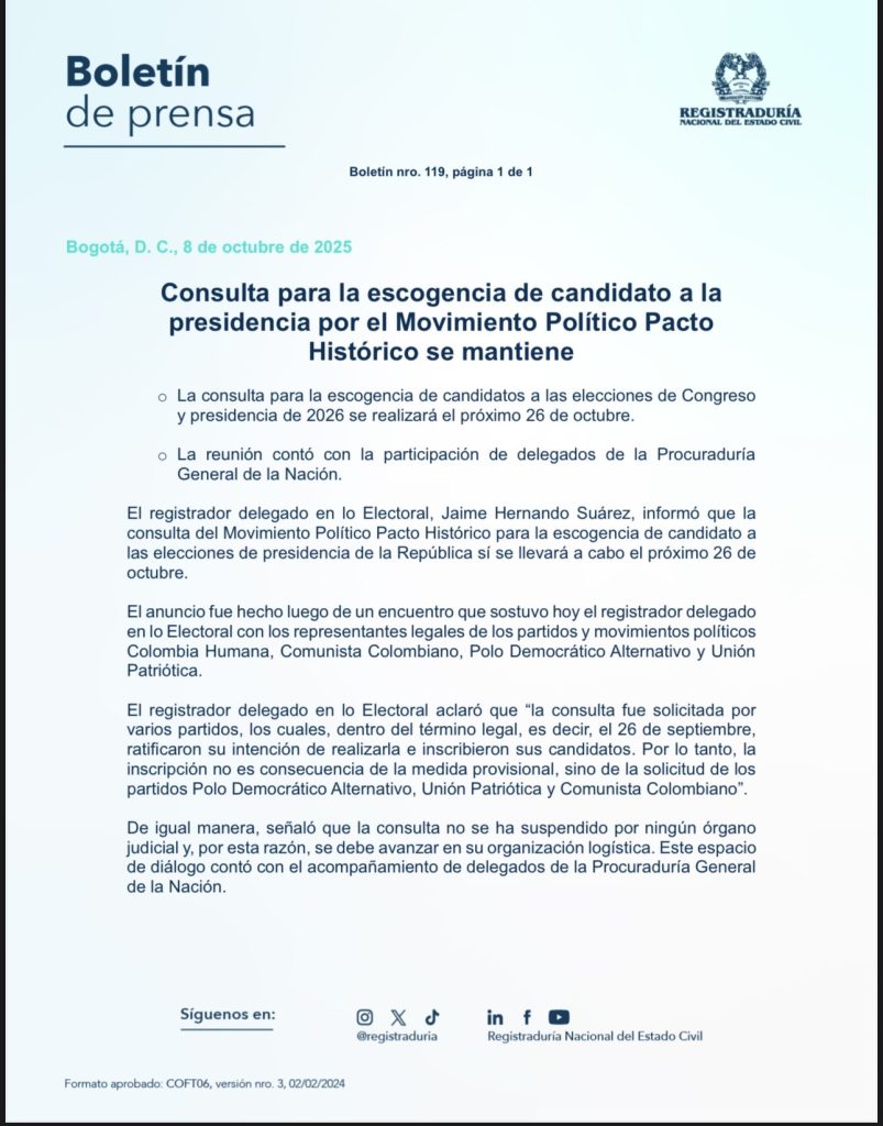 La Registraduría Nacional del Estado Civil ratificó que la consulta interpartidista del Pacto Histórico para definir candidatos al Congreso y a la Presidencia de 2026 se mantiene para el próximo 26 de octubre.